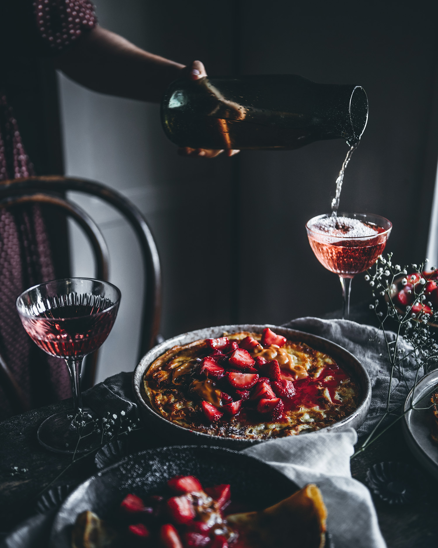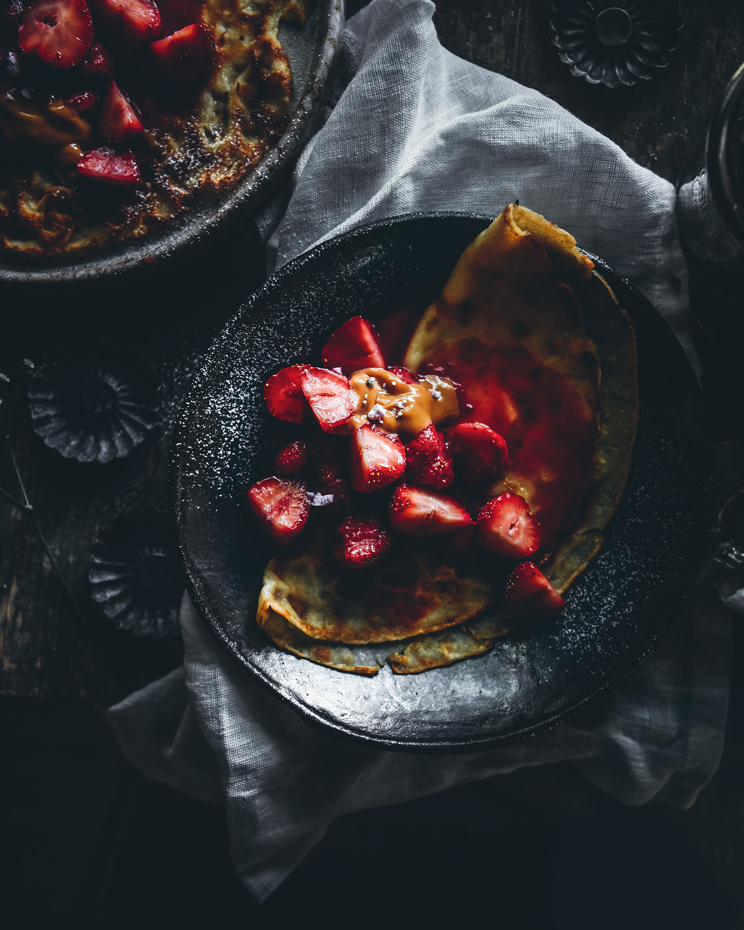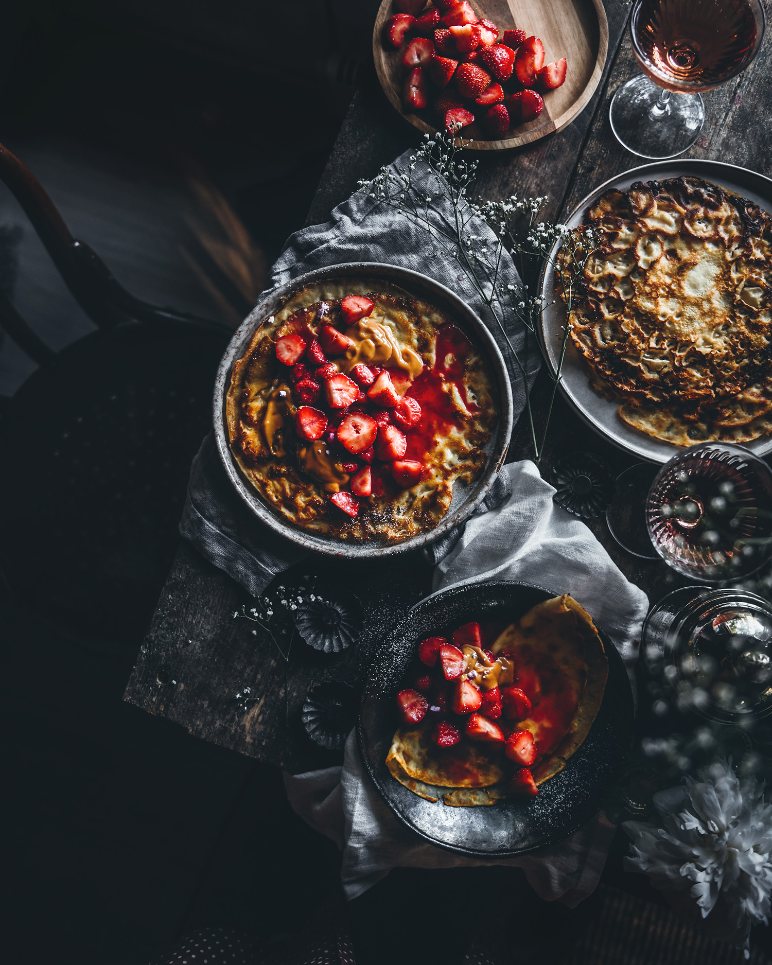 - Enjoy the crêpes hot with caramelised condensed milk, fresh strawberries and quickly made strawberry compot!